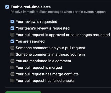 - Use VCS / Messaging integration to be notified about reviews you’ve been tagged on in real-time. Here’s an example of my GitHub / Slack settings for getting DM’d in Slack: