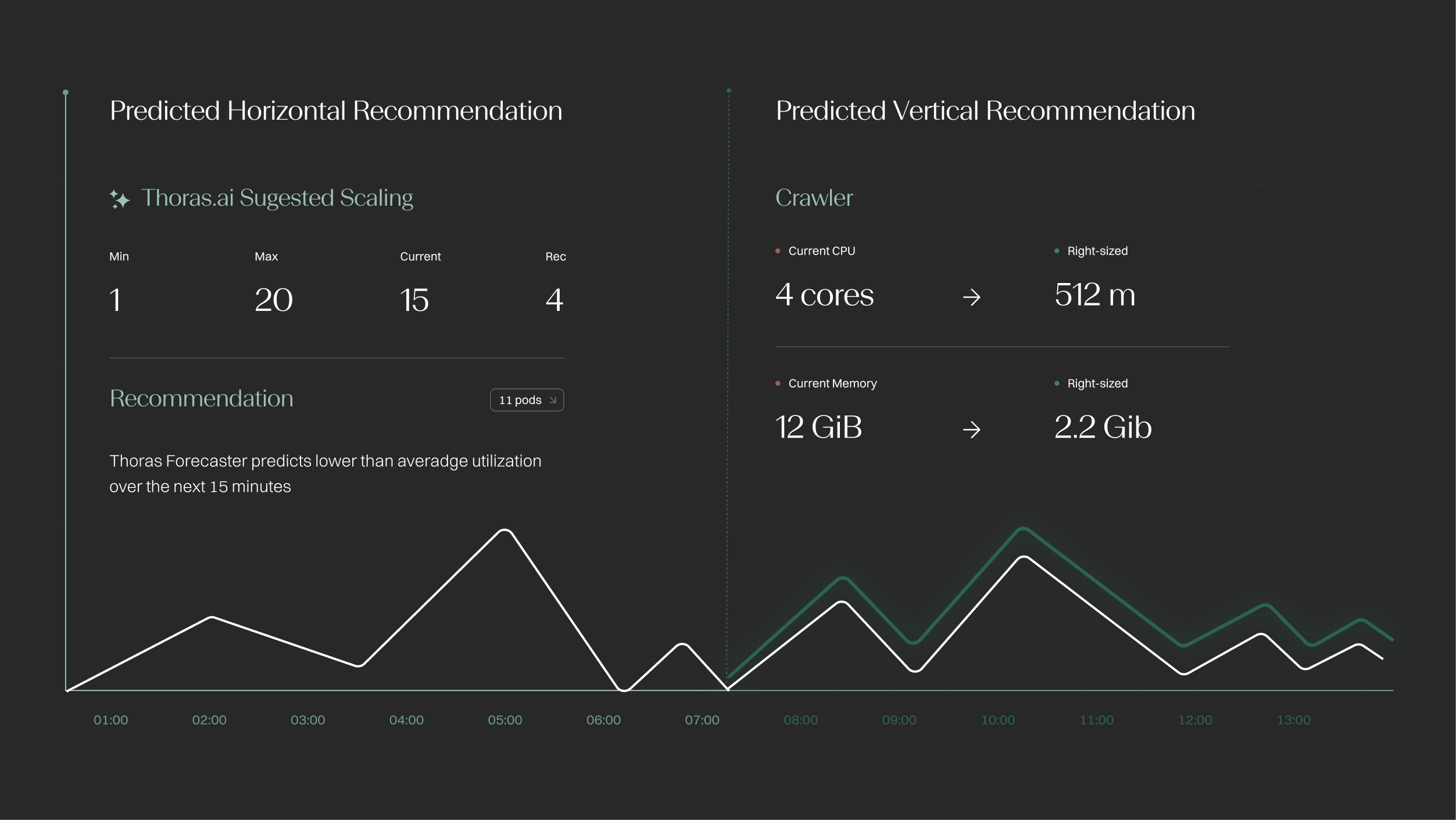 Thoras uses machine learning to forecast what your pods actually need and adjusts CPU and memory before demand changes. No restarts. No OOMs. No over provisioning.